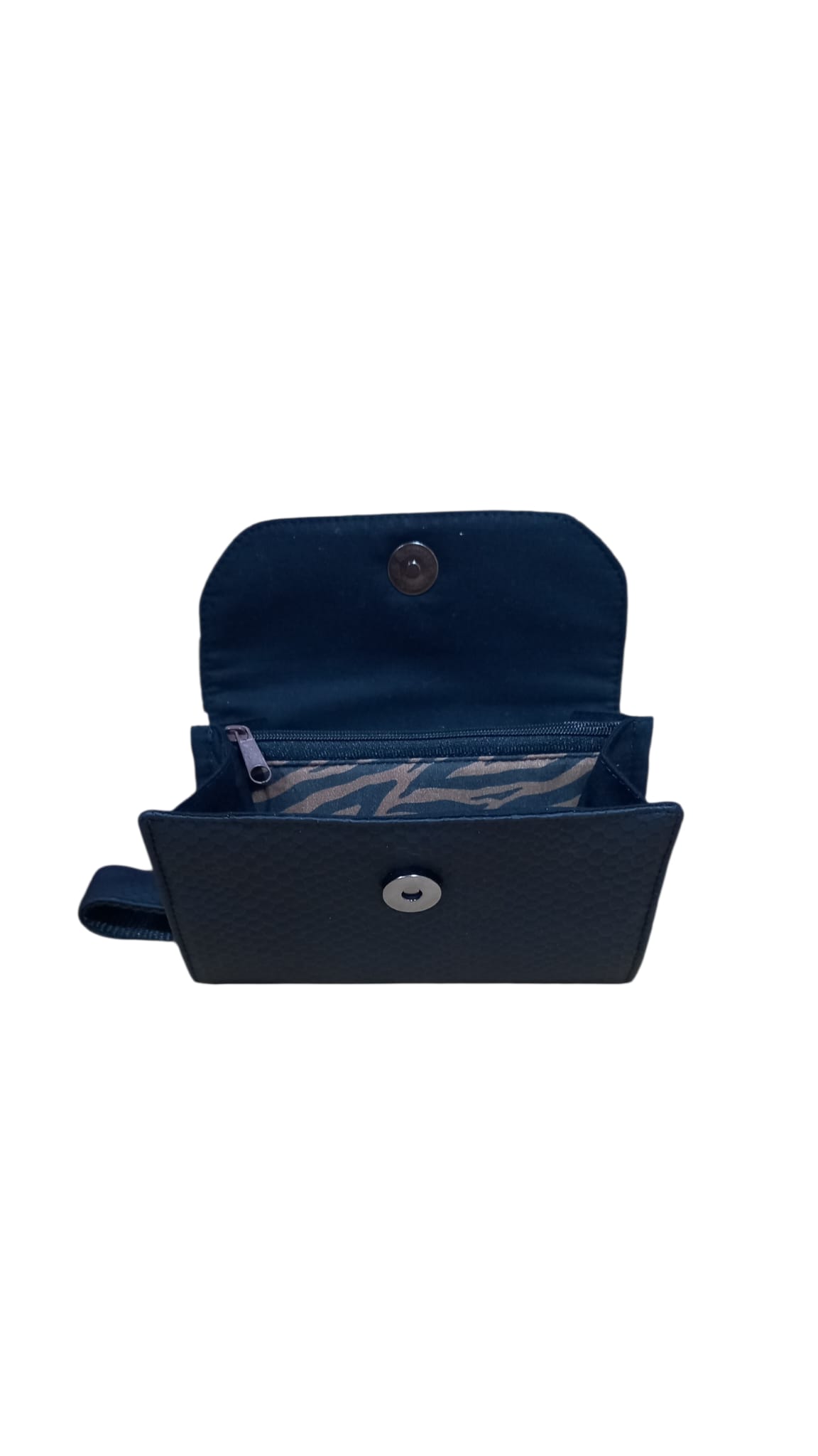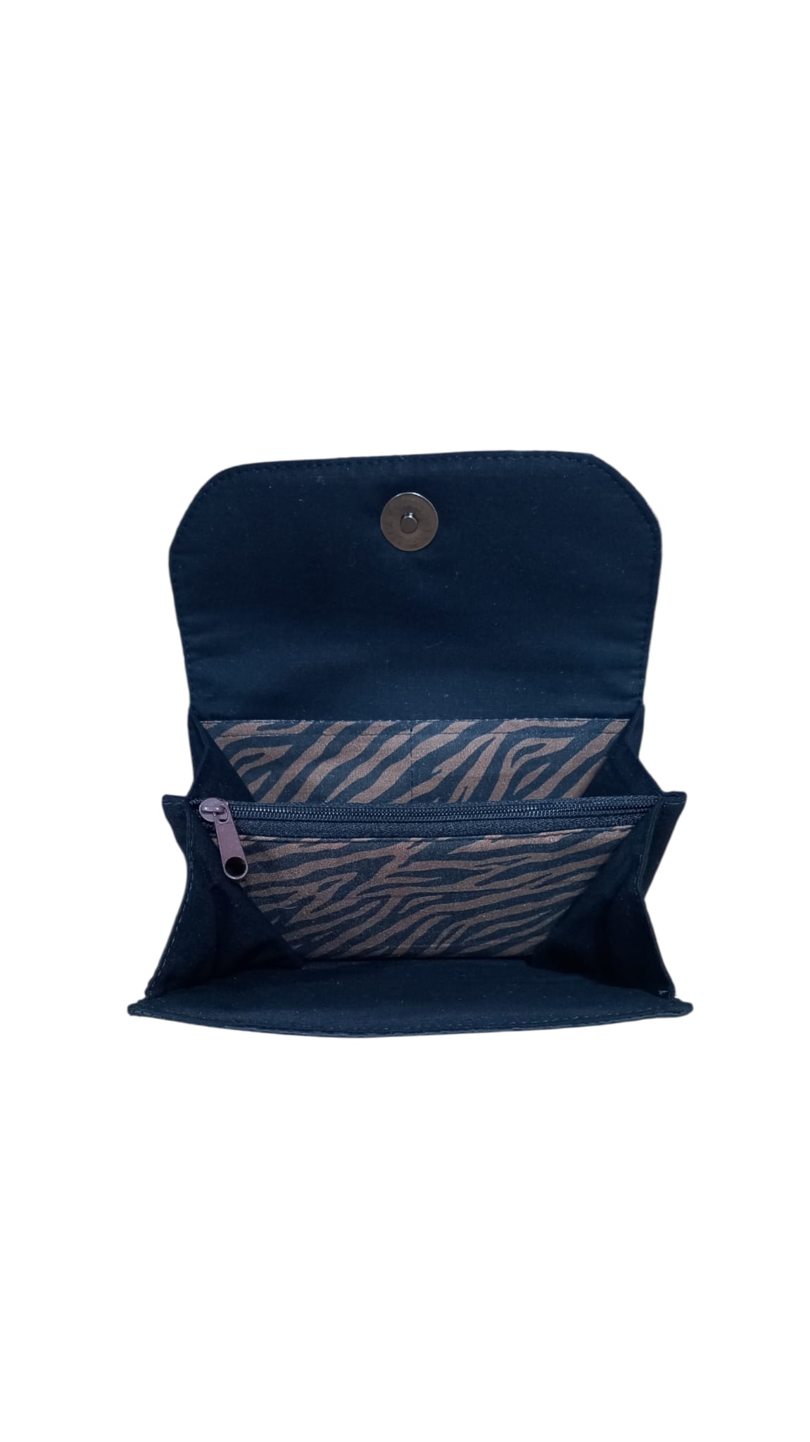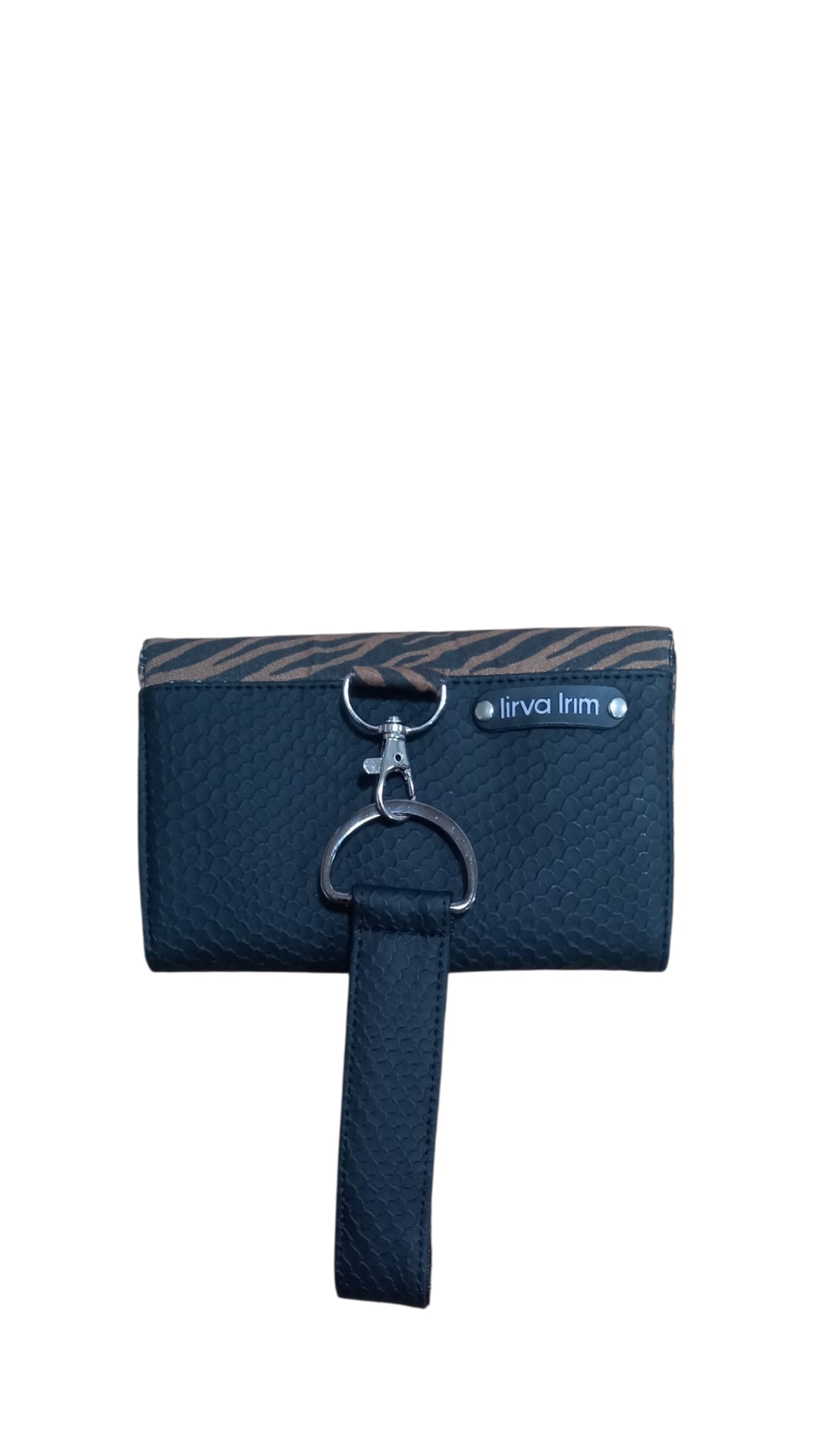 Tejido en polipiel negro en escama, combinado con estampado de cebra. Con unas medidas aproximadas de 11 x 16 cm (cerrado), tienen el tamaño ideal para llevar lo imprescindible sin ocupar espacio de más.